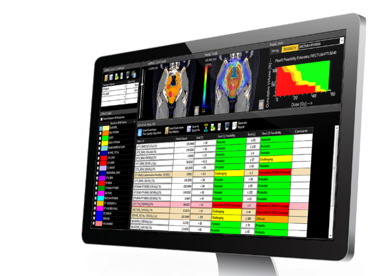 Pontuação de Qualidade do Plano: Com base nos seus objetivos clínicos, cada alvo e órgão em risco recebe uma pontuação de qualidade. O plano de tratamento recebe uma pontuação de Métrica de Qualidade do Plano (PQM) e uma pontuação de PQM Ajustado (APQM) personalizada para a análise de viabilidade específica do paciente.