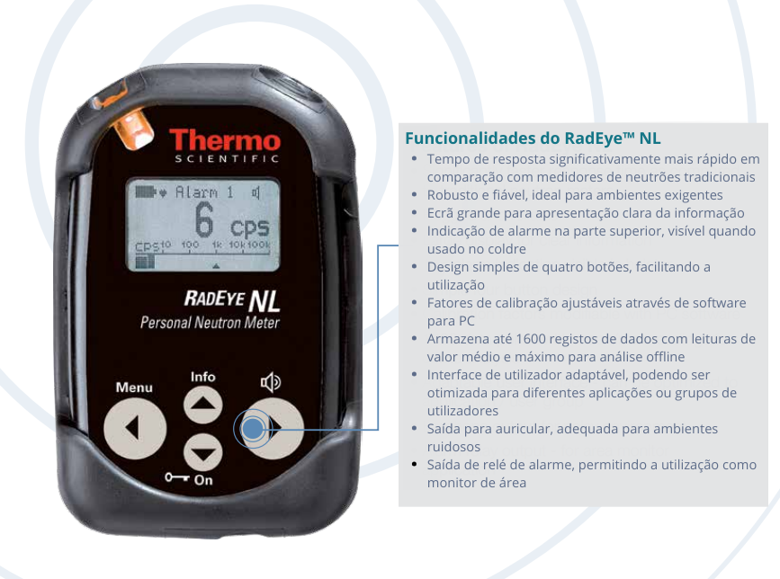O RadEye™ NL da Thermo Scientific é um detetor portátil de radiação de neutrões, desenvolvido para fornecer monitorização rápida e precisa de campos de radiação de neutrões em instalações nucleares, centrais elétricas e aceleradores de partículas. Com alta sensibilidade e resposta rápida, é uma alternativa compacta e leve aos volumosos Rem counters tradicionais.